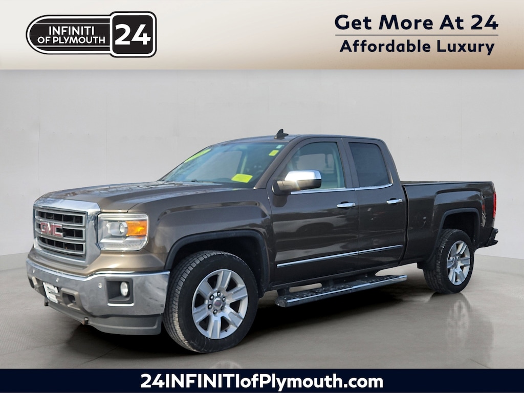 Discover rugged capability and premium comfort in this Brown 2015 GMC Sierra 1500 SLT 4x4 Double Cab with a 6.5 ft. short bed. Powered by the EcoTec3 5.3L V8 engine and paired with a 6-speed shiftable automatic transmission, this truck is ready for any job or adventure. Enjoy the SLT Preferred Package, leather-trimmed upholstery, heated front seats, and power-adjustable driver and passenger seats for a luxurious ride. The Off-Road Suspension Package, rear locking differential, and part-time 4WD with on-demand setting make it a great choice for off-road enthusiasts. Stay connected with an 8-inch color touchscreen featuring IntelliLink, navigation, Bluetooth, Pandora radio, SiriusXM, and a Wi-Fi hotspot. Other highlights include remote engine start, integrated trailer brake controller, spray-on bed liner, chrome tubular assist steps, polished aluminum alloy wheels, and a rearview camera. Safety features like front and rear side curtain airbags, stability control, and trailer stability control provide peace of mind. Visit us today to experience this versatile and well-equipped Sierra 1500 in person!